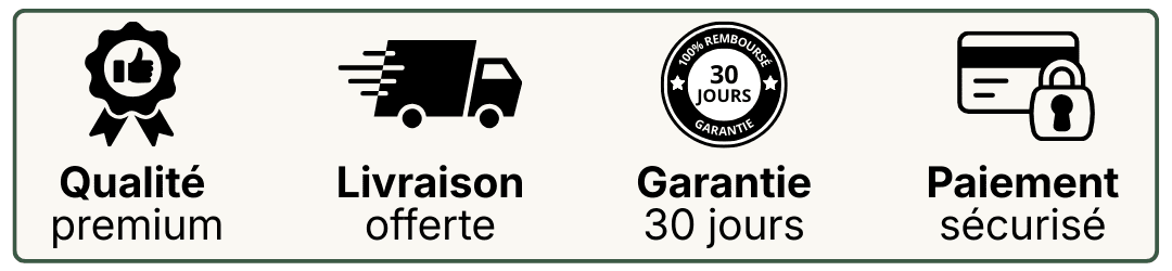 Nous offrons une garantie de satisfaction de 30 jours. Si vous n'êtes pas entièrement satisfait de votre achat, vous pouvez nous le retourner pour un remboursement complet, sans poser de questions.