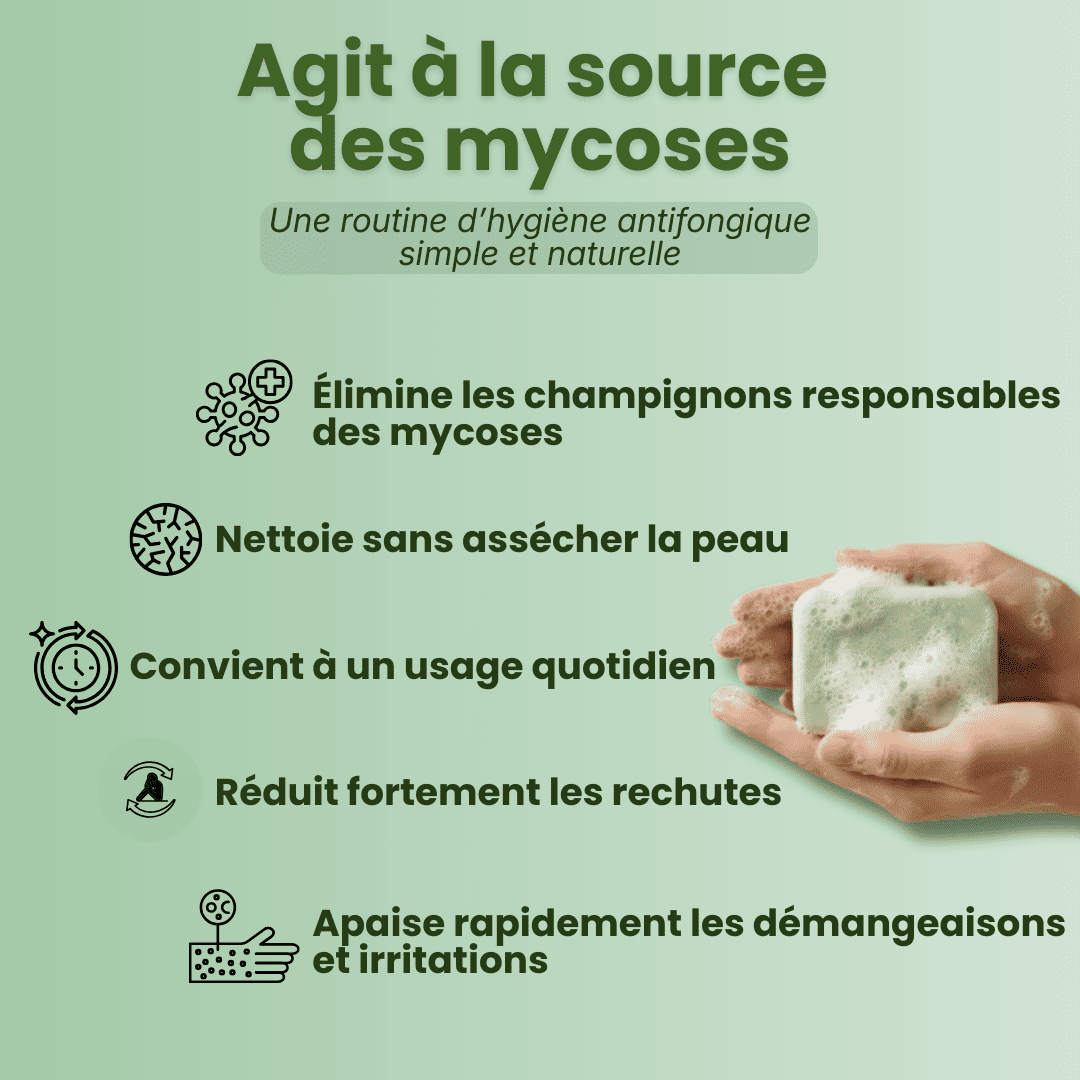 Développé pour les peaux sujettes aux mycoses, notre savon nettoie en douceur et contribue à préserver l’équilibre cutané, jour après jour, sans agresser la peau.